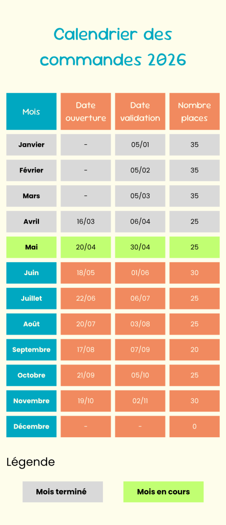 - Chaque mois, j’ouvre les formulaires de commande* à une date prédéfinie. La prise de commande est donc possible.